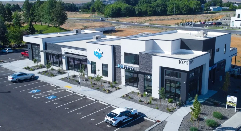 The Devfuzion Building project is a new two-story, mixed-use office and retail building located at 10711 W Clearwater Ave in Kennewick, WA, with a total area of approximately 10,373 square feet. The building includes main level office space, three tenant retail spaces, a second-level office suite, and a second-floor deck, and is designed with modern finishes, energy-efficient systems, and ample parking. Site improvements include landscaping, stormwater management, and infrastructure for future electric vehicle charging.